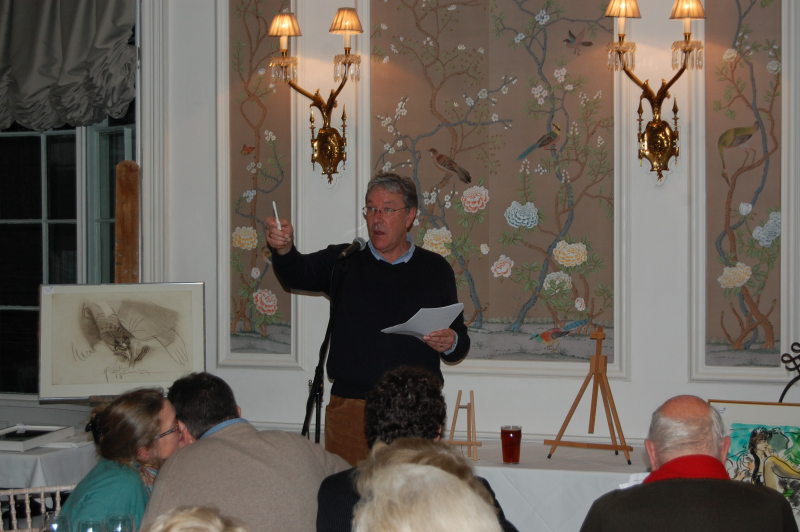 The auction sale started in slow motion, with somewhat restrained and desultory bidding, at one point leading the auctioneer to exclaim: “ You’ve been sitting here not bidding £50, but waiting for the big one, but is it going unsold at £2,000? No! It’s sold to the gentleman in the orange shirt.” Other lots attracted bids from Italy and France; The Phantom of the Opera was knocked down to a Monsieur Pierre: “It eez un snip,” cried the auctioneer. He was ably assisted by Niki Stuart (see photo below), who did an admirable turn as auction-house porter. For some works, such as the silkscreen lithograph Untitled by Therese Oulton, there was fierce competition – well, polite competition, because it is Rye after all.