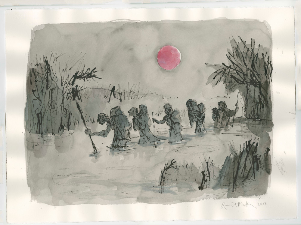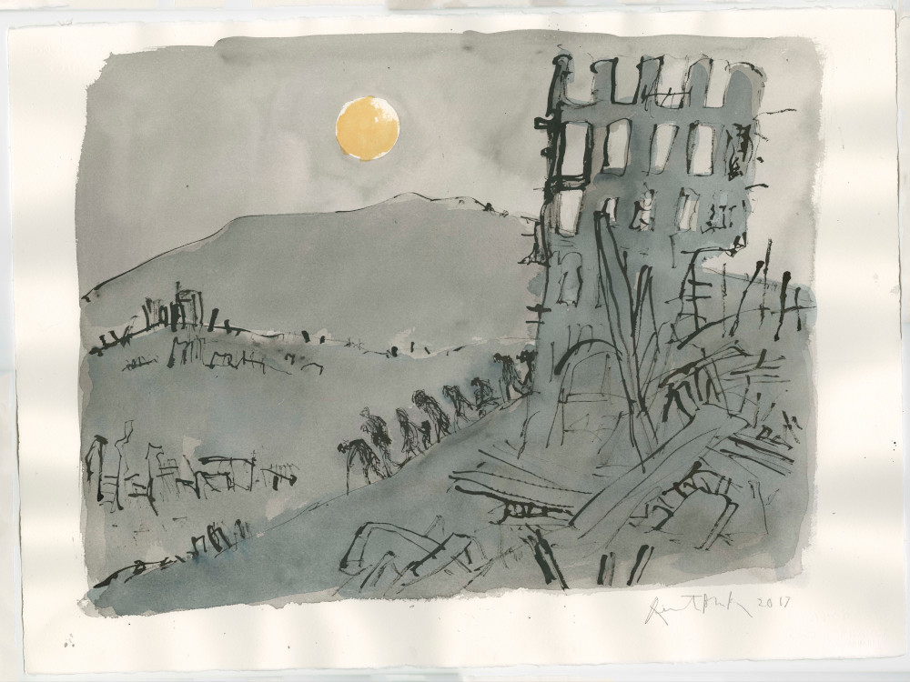 The subject matter seems drawn from a world, much like our own, pushed to the cliff-edge of its own existence: displaced figures rove across empty landscapes blasted by war, or ecological crisis; sinister planes and drones haunt the skies above; and the implacable stares of dozens of anxious and havoc-struck faces are the focus of an array of portrait studies of assorted refugees, apprehensive women, orphans, ‘unfortunates’, and some grotesques Blake has called ‘eroded heads’.