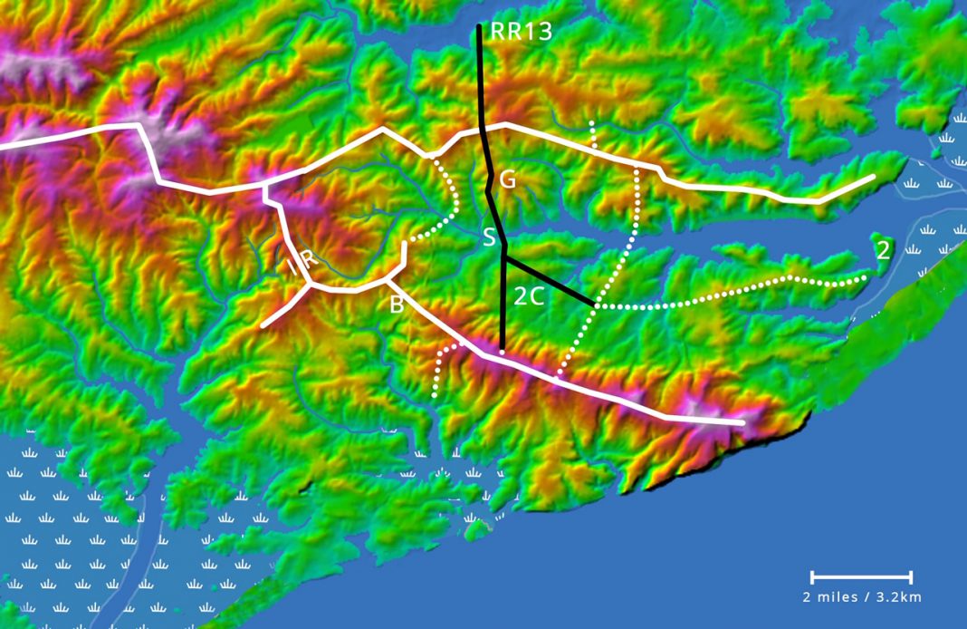 These two estuaries enclosed a physically distinct Hastings peninsula that was almost an island. Its isthmus (IR on map above) at what is now Sprays Woods on the Battle Road [the B2096 near Netherfield] was barely 600m across.