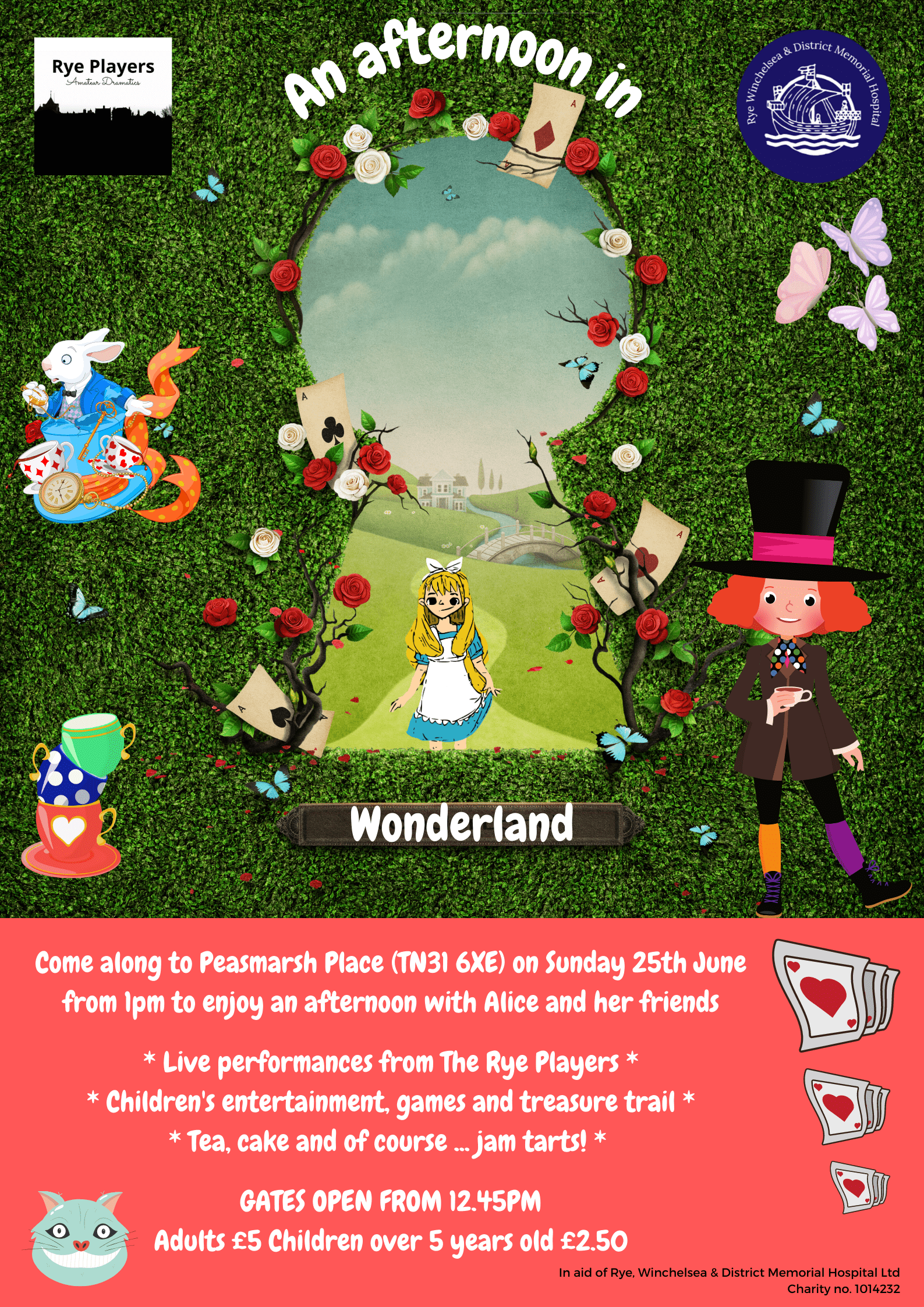 We are delighted to announce that we will be adding an extra event to our 2023 programme! On Sunday 25th June ‘An Afternoon in Wonderland’ will be held at Peasmarsh Place (TN31 6XE) from 1pm. The Rye Players will be performing a series of scenes featuring some of Lewis Carroll’s characters throughout the afternoon. There will also be other entertainment, games and refreshments for everyone to enjoy. We hope you are able to come along and enjoy this one off event in beautiful surroundings. A huge thank you to all of the staff and residents at Peasmarsh Place for agreeing to let us take over for an afternoon!
