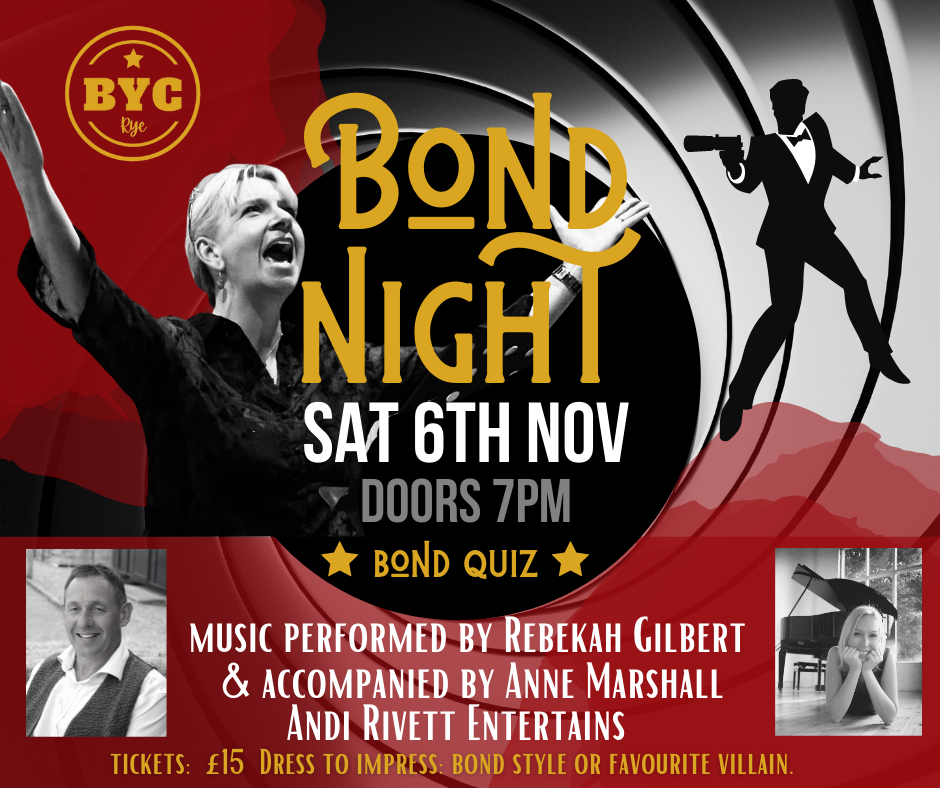 We’ll roll out the red carpet for you at The Brewery Yard Club for one night only at this very special Bond-themed night out. You’ll get to experience the incredible voice of Rye’s own Lady Mayor, classical soloist Rebekah Gilbert accompanied by renowned international classical pianist Anne Marshall. Together they will be performing all the favourite Bond theme tunes through the years.