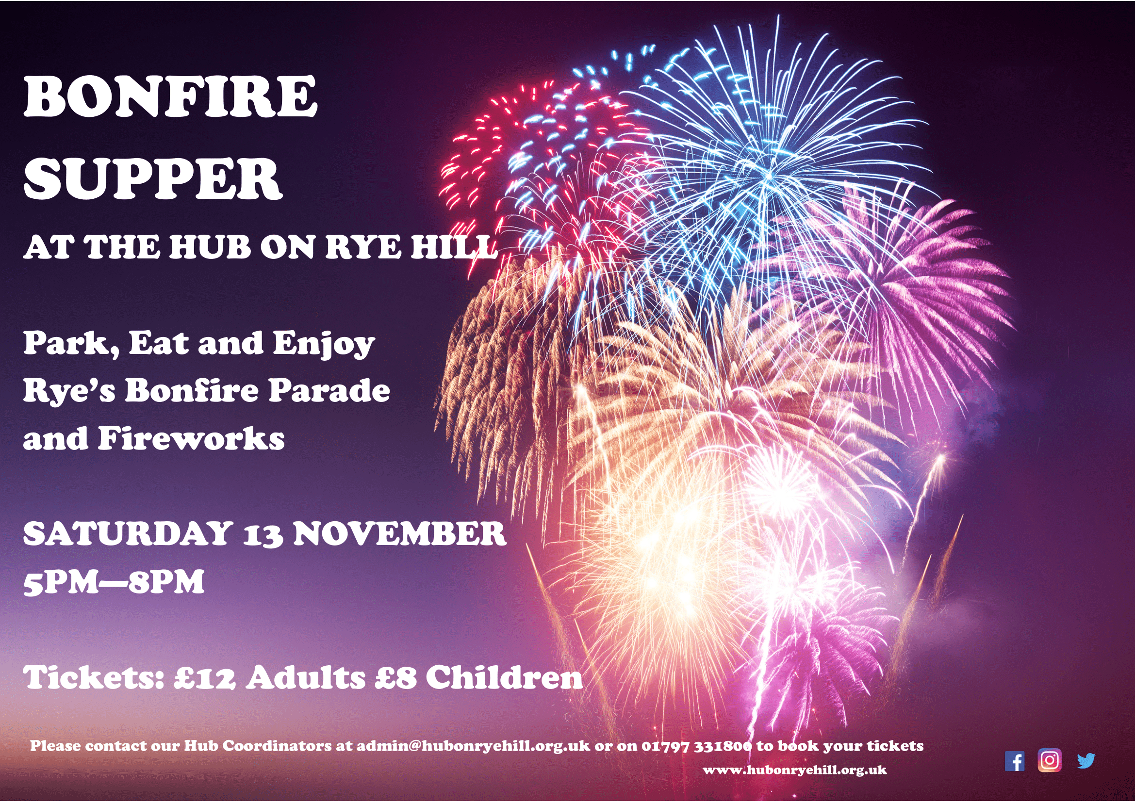 The Hub on Rye Hill are hosting a Bonfire Supper with parking available on site. Please contact the Hub Coordinators on 01797 331800 or at admin@hubonryehill.org.uk for more details and to book your tickets. Adults – £12, Children – £8