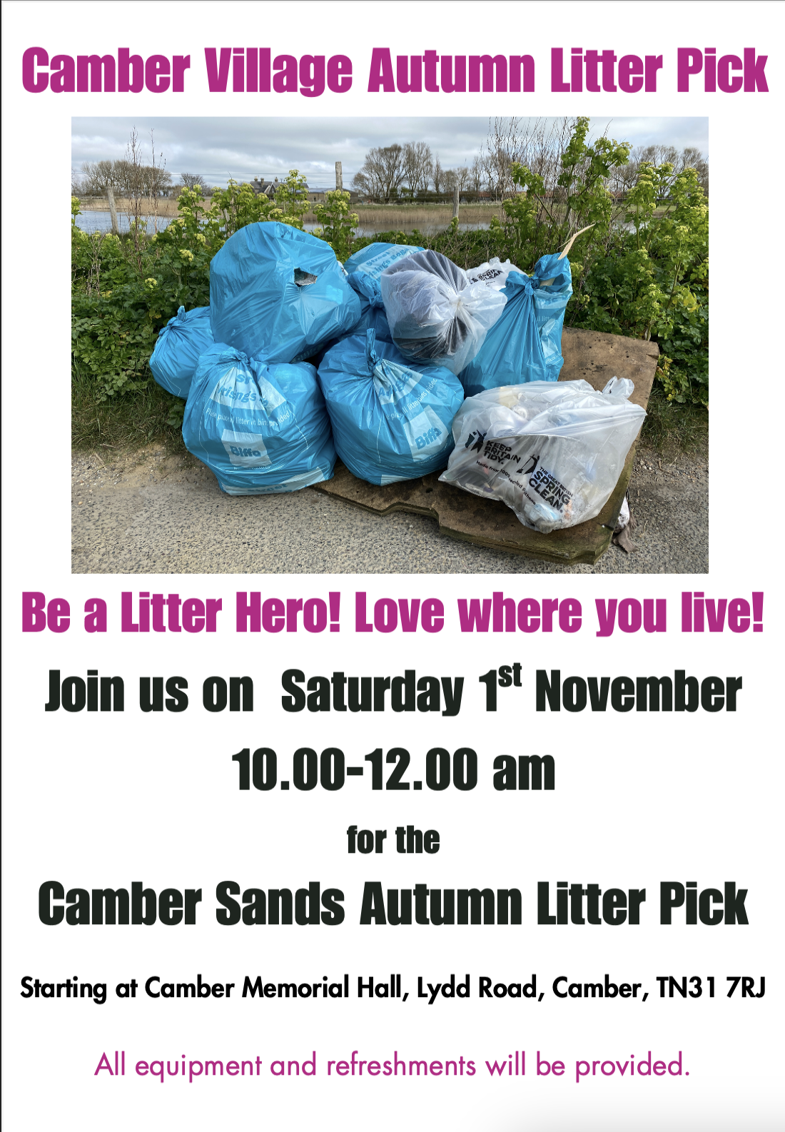 Come and join us in Camber Village for our autumn clean up. All help incredibly welcome. Equipment and refreshments provided.