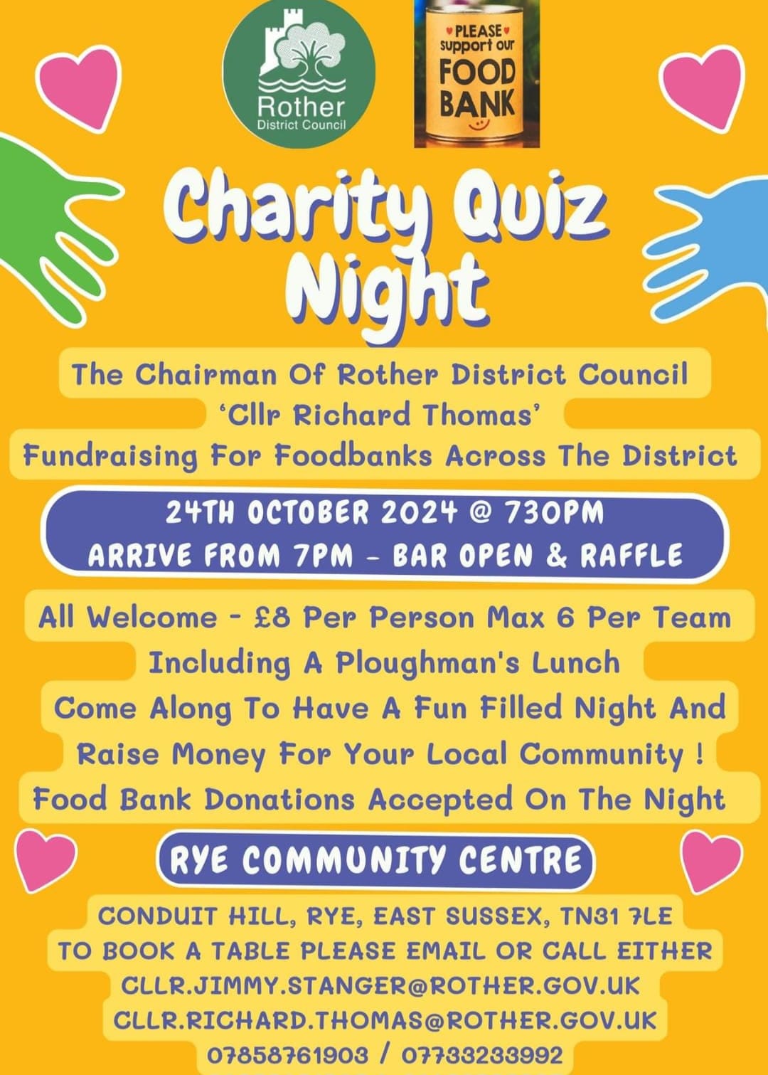 To book a table please email or call either cllr.jimmy.stanger@rother.gov.uk (07858 761903) or cllr.richard.thomas@rother.gov.uk (07733 233992)