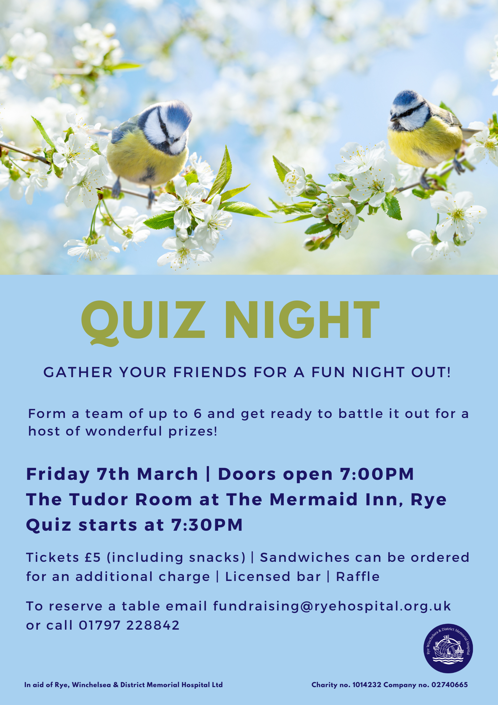 Our popular Quiz Night devised by our regular quizmasters, Tracey and Graham, will be returning on Friday 7th March at the Mermaid Inn. Teams of up to 6 can reserve their table by emailing Fran Clent at fundraising@ryehospital.org.uk or by calling 01797 228842. Tickets are £5 per team member. Light snacks are included and sandwiches can be pre-ordered for an additional charge. Doors open from 7pm and the quiz will start at 7.30pm. There will be team prizes and a raffle!