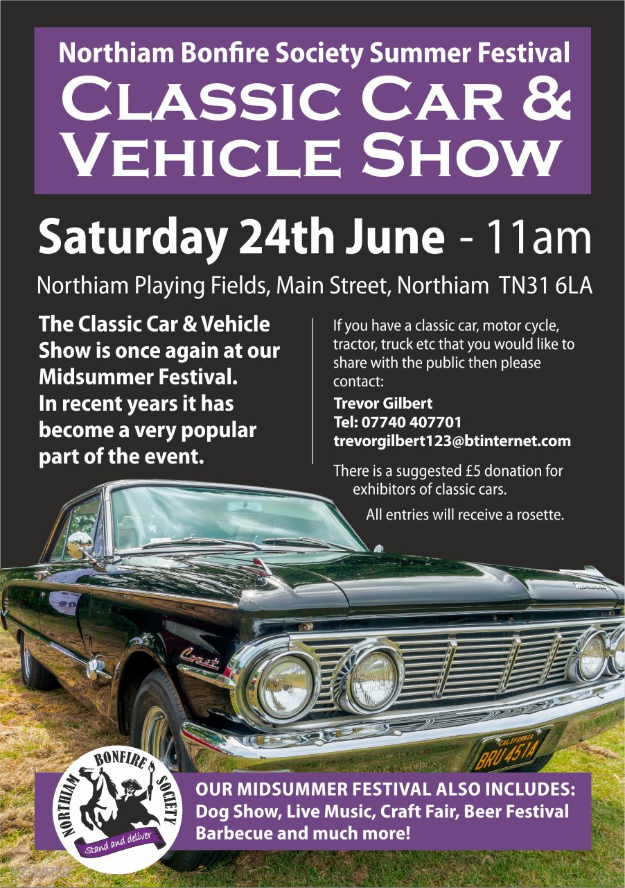 As part of Northiam Bonfire Society’s Midsummer Festival, we will, once again, be holding a Classic Car and Vehicle Show. If you have a classic car, motorcycle, tractor, truck etc that you would like the public to see, please contact Trevor Gilbert: trevorgilbert123@btinternet.com 07740 407701, trevorgilbert123@btinternet.com
