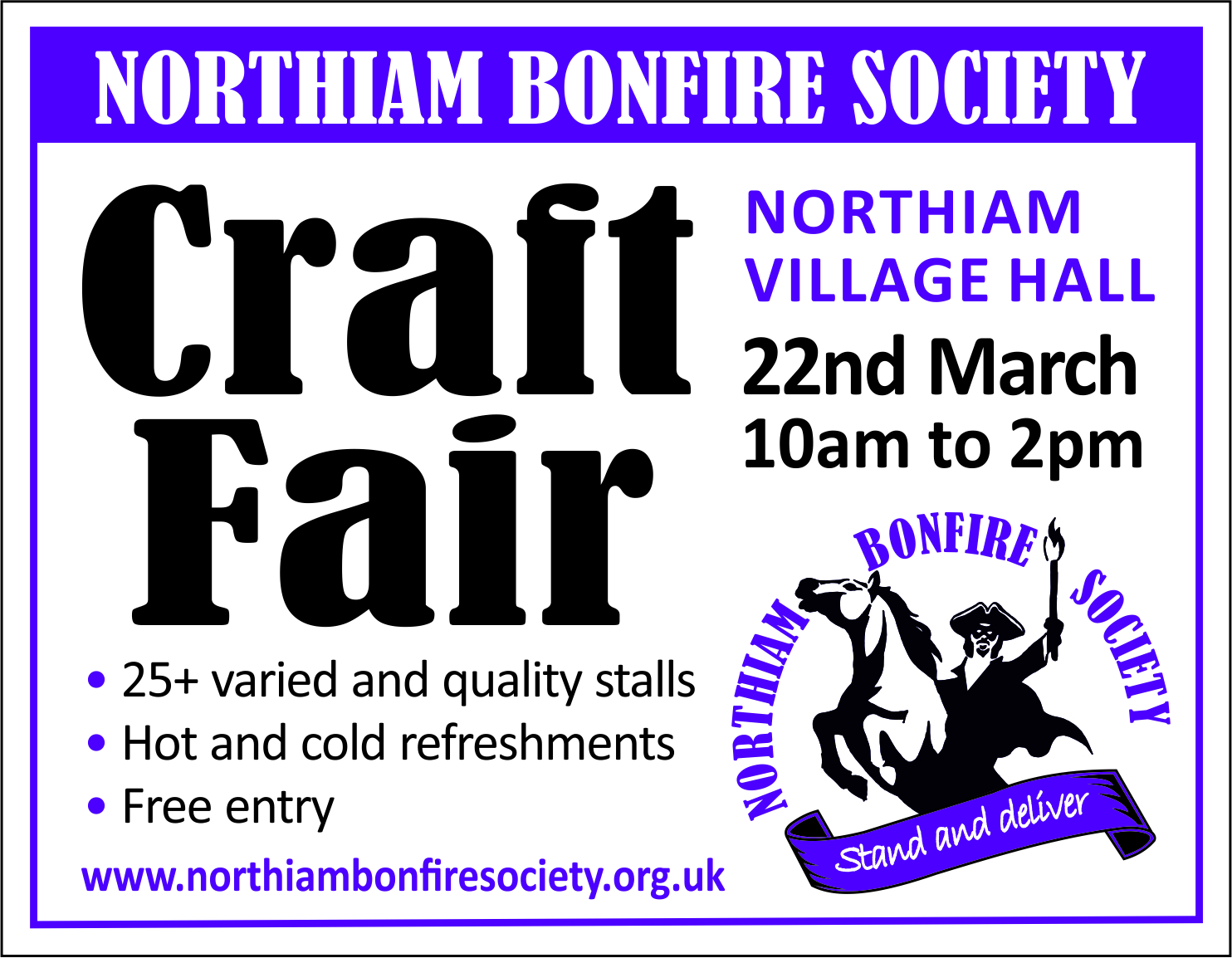 Northiam Bonfire Society’s next CRAFT FAIR will be held in Northiam Village Hall on Saturday 22nd March 10am to 2pm, in plenty of time to help with your Mother’s Day gifts. There will be over 25 varied, quality stalls featuring local craftspeople and makers with plenty of ideas for gifts or treats for yourself.