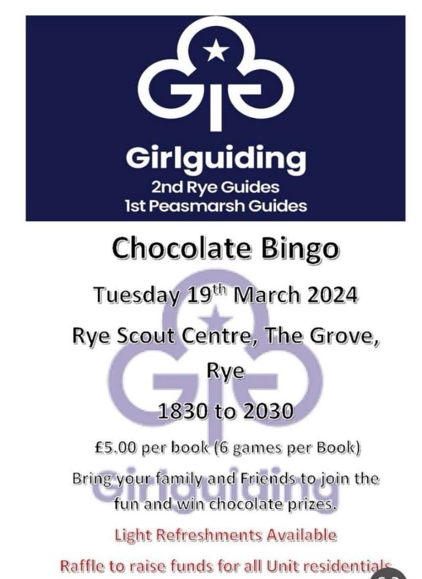The 2nd Rye Guides and the 1st Peasmarsh Guides have organised a Chocolate Bingo raffle to raise funds for Unit residentials at the Rye Scout Centre, The Grove, Rye on Tuesday 19th March at 18:30