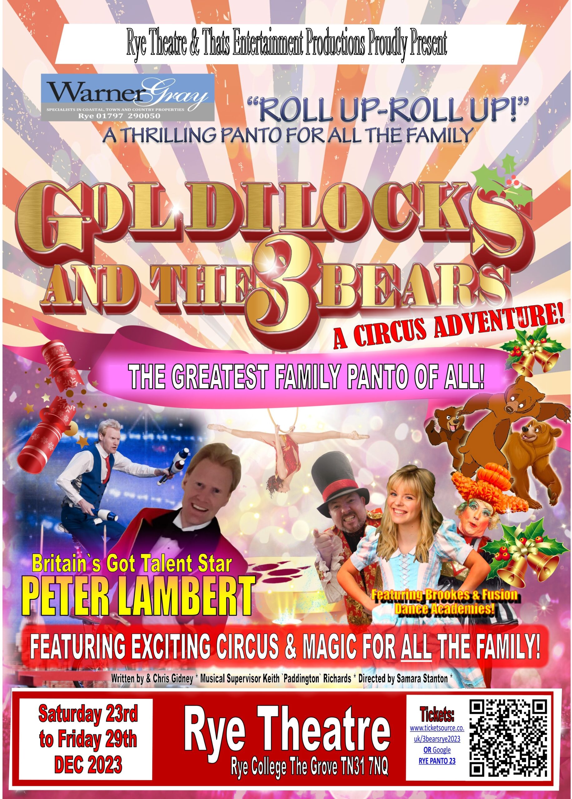 That’s Entertainment Productions bring this enchanting and exciting new production to Rye audiences this Christmas! Featuring ITV`s Britain`s Got Talent star PETE LAMBERT as Silly Billy, this much-loved fairy tale is set in the circus where Goldilocks, Dame Dolly and Silly Billy fall upon hard times. They befriend and enlist the help of three talented and musical bears to bring their circus fortunes back to life. However, the evil Ringmaster, Baron Von Lader-Heusen has other ideas, plotting to capture the Bears and make them work for him. It takes Goldilocks, Silly Billy and your help to outwit the Baron and rescue the bears in a heart-warming happy ending full of Circus, Music and Magic for everyone! Featuring amazing Circus acts, packed with hilarious comedy, songs and dance making it a thrilling family show for all ages.