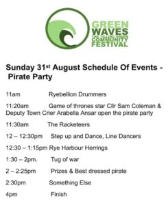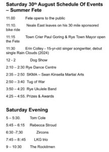 Saturday will include family entertainment with an arena featuring a dog show, games like tug-of-war and performances by local dance groups and martial arts teams. Our stage will feature several fun bands while participants can visit sideshow games, local organisation booths, food vendors, a tea tent, a beer tent and enjoy circus acts and, we hope, a celebrity appearance. Plus expect with a rousing performance by Rye’s own super group, the Rockitmen.