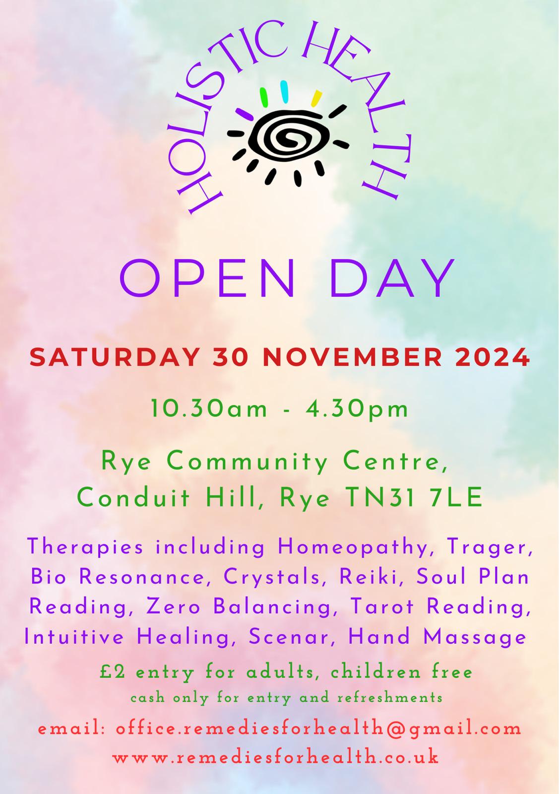 Our Donation based Drop In Clinic, a group of 18 strong therapists that practice in rotation every Friday afternoon from 1pm – 4pm at Rye Community Hall, are holding a wonderful Open Day promoting Holistic Healthcare for all. We will have some of our Therapists that work at the weekly Drop-In, along with a whole host of other Therapists to help you to heal.