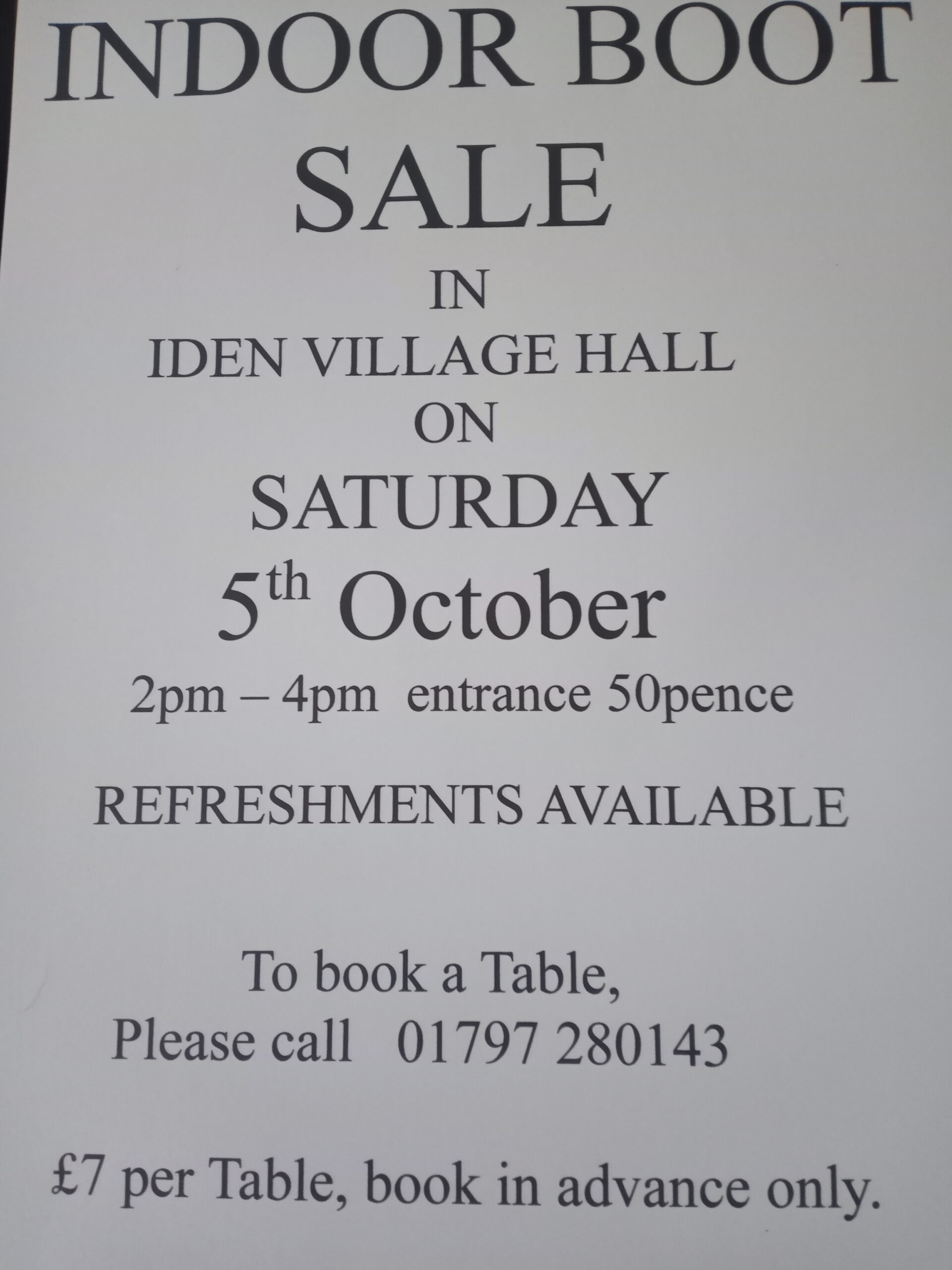 In Iden Village Hall on 5th October 2pm, disabled friendly, dogs welcome, ample parking. 50p entry, homemade cakes, tea/coffee. To book a table phone 01797 280143 £7.