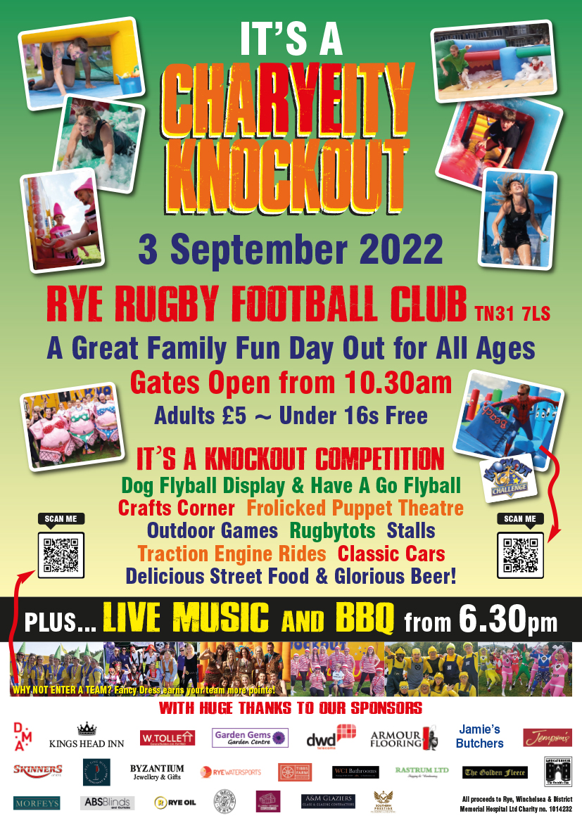 An exciting new event is coming to the Rye RFC grounds centred around an It’s a Knockout Competition in aid of the Hospital at Rye. There will also be a variety of family entertainment including a dog Flyball display, ‘Have a Go Flyball’, craft corner, puppet theatre, stalls, classic cars, all day refreshments, outdoor activities for children and much more!