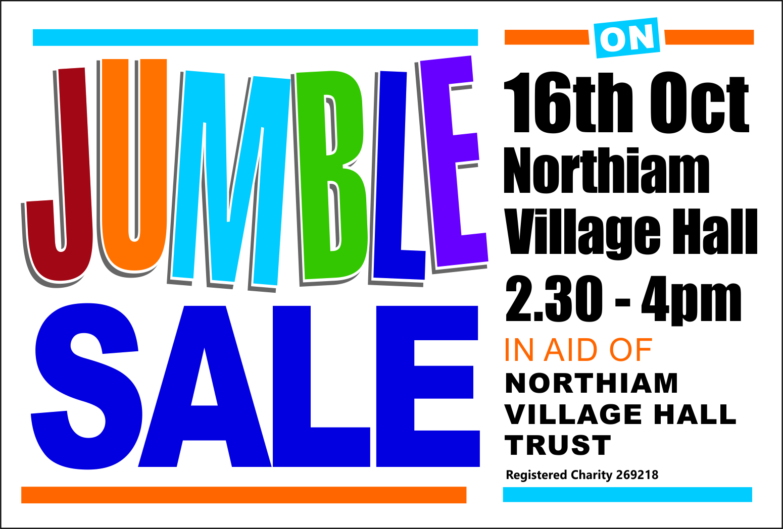 Jumble Sale Come along and snap up a bargain! Northiam Village Hall on Saturday 16th October 2.30-4pm + Add to Google Calendar + iCal / Outlook export The event is finished. Date Oct 16 2021 Expired! Time 2:30 pm - 4:00 pm More Info Read More Category Charity Share this event