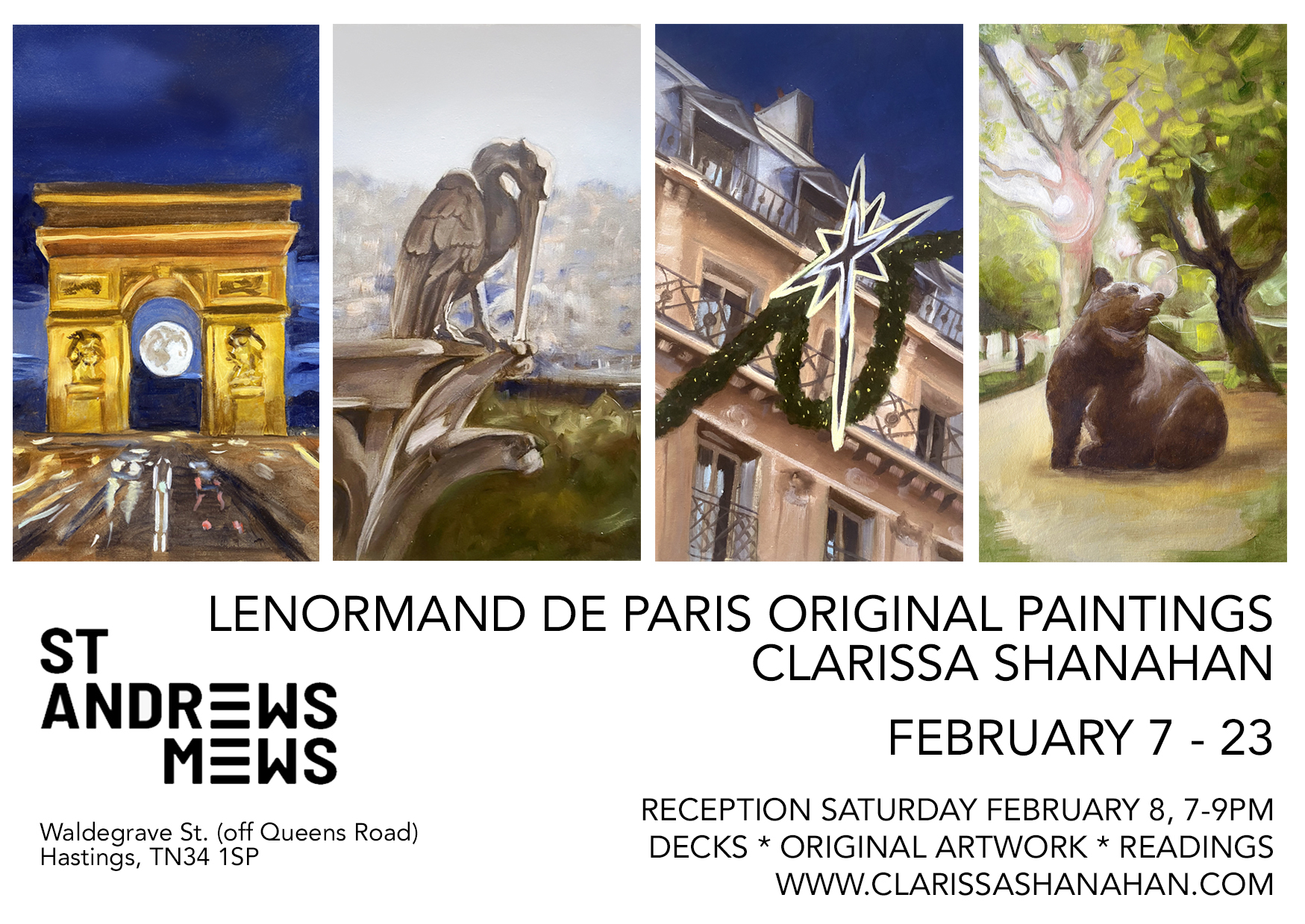 Swing by during gallery hours (Thursday to Sunday, 1 PM to 5 0r 7 PM) and don’t miss the opening reception on Saturday, February 8, from 7–9 PM. There will be artwork, Lenormand de Paris decks for sale, and tarot readings to add a little bright spot to a winter night.