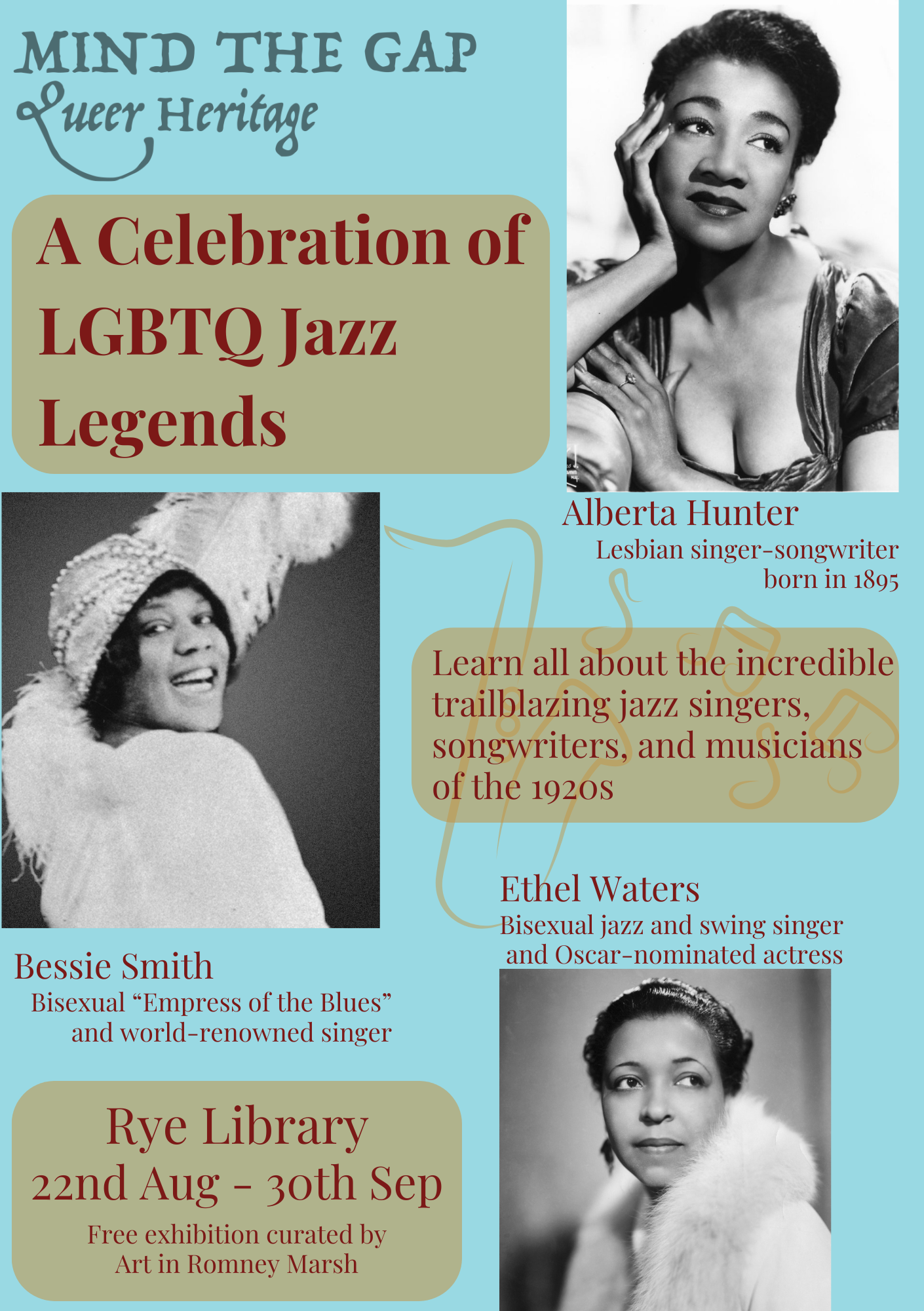 is a pop up exhibition in partnership with Rye library celebrating Rye International Jazz & Blues Festival and Heritage month. Art in Romney Marsh wants to celebrate the black queer creatives from the American Jazz scene circa 1920’s. Why Bessie Smith, well in 1920’s everyone was listening to the music coming from America : Jazz and Blues and guess what some of those amazing musicians, and singers were African American and Queer. Our partnership with Rye library is a chance to celebrate Queer creatives that have local connections and to look for the musical connections to Rye ’s queer history and heritage to celebrate writers, musicians and performers like Gladys Bentley, Alain Locke, Ethel Waters, Bessie Smith, Jimmie Daniels, Ma Rainey, Langston Hughes The Mind the Gap project is funded by The Heritage Fund