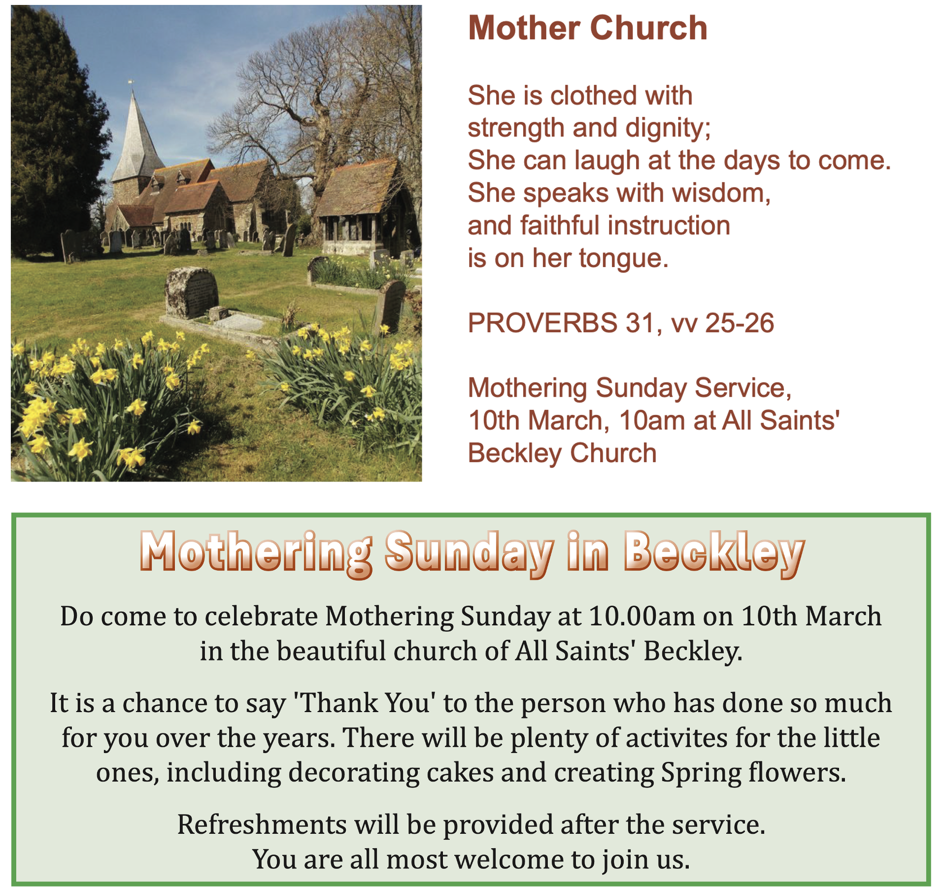 Do come to celebrate Mothering Sunday at 10.00am on 10th March in the beautiful church of All Saints’ Beckley.