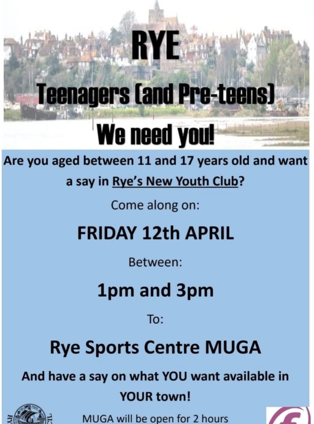 If you are aged between 11 and 17 come and enjoy MUGA at Rye Sports Centre on Friday 12th April between 1pm and 3pm and have a say on what YOU want available in YOUR town!