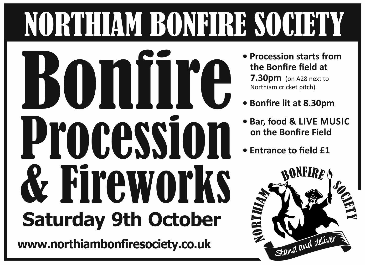 Northiam’s Bonfire Procession will be held on Saturday 9th October, leaving the Bonfire Field (on the A28 south of the village) at 7.30pm, processing into the village, and returning for the lighting of the Bonfire at about 8.30pm followed by fireworks.
