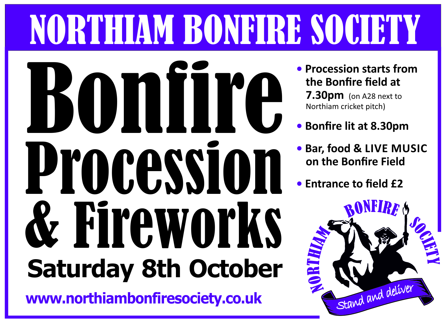 Northiam’s Bonfire Procession will be held on Saturday 8th October, leaving the Bonfire Field (on the A28 south of the village) at 7.30pm, processing into the village, and returning for the lighting of the Bonfire at about 8.30pm followed by fireworks.
