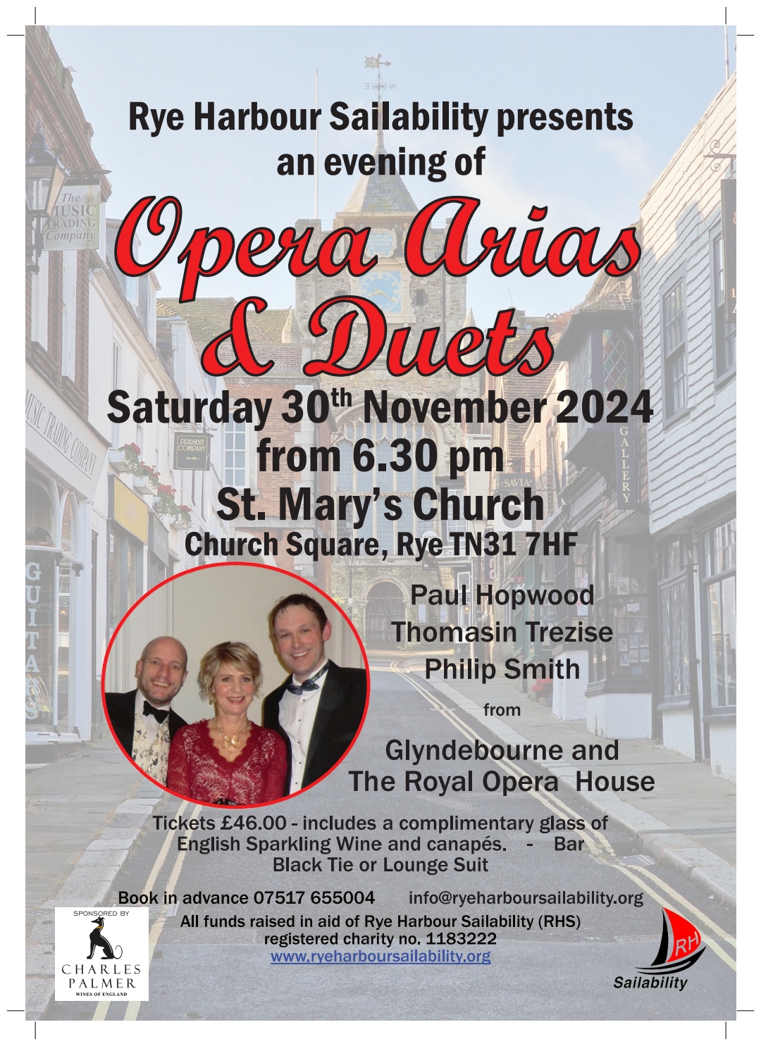 Due to the popularity of the Opera evenings held over the last three years Rye Harbour Sailability are proud to present another evening of Opera at St Mary’s Church in Rye. Thomasin Trezise, Paul Hopwood and Philip Smith will perform some of the most celebrated opera arias and duets and more. Once again Charles Palmer Vineyards will sponsor the superb English sparkling wine for the evening.  You will receive a complimentary glass on arrival at 6.30pm along with complimentary canapés provided by the Deli in Rye.