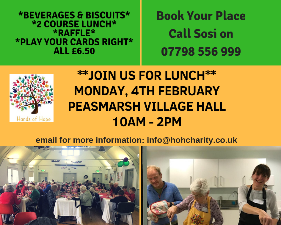 Hands of Hope, who are a local, community-based charity, run a monthly lunch club at Peasmarsh Village Hall on the first Monday of the month. Enjoy a healthy, nutritious, 2-course meal followed by a fun raffle and entertainment – all for £6.50 per person. Timings are 10:00am to 2:00pm.