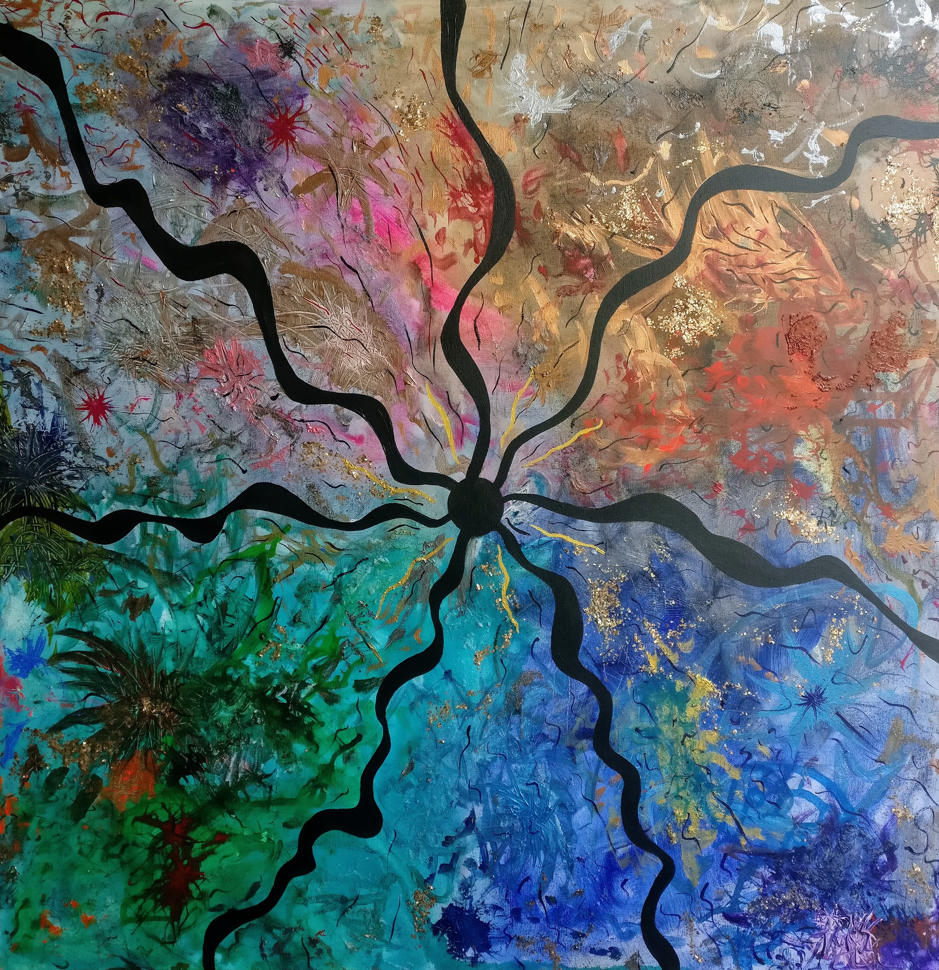 Tina is an artist, composer and furniture upcycler from Rye. She is well travelled and has lived in some interesting parts of the world and her audio and visual creations reflect the diverse tapestry of culture, colour and natural splendour she has experienced. Her visual work is characterised by a vibrant colour palette, bold, fluid designs and a proclivity towards metallics. You’ll almost always find the addition of gold paint or a flash of gold mica flakes, which have become somewhat of a trademark style.