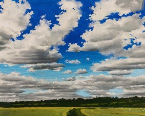 The image shows ‘Brede Valley Clouds’, an oil on canvas by the award-winning artist A. Lincoln Taber. It is priced at £395. Rye Art Gallery