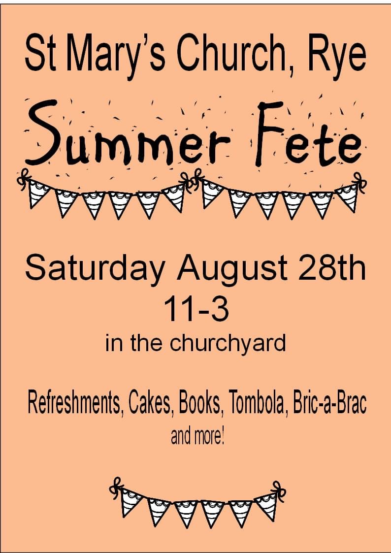 Summer Fete St Mary’s Church, Rye. Summer Fete in the churchyard + Add to Google Calendar + iCal / Outlook export The event is finished. Date Aug 28 2021 Expired! Time 11:00 am - 3:00 pm Location St Mary's Church St Mary's Church, Church Square, Rye, TN31 7LB Category Charity Share this event