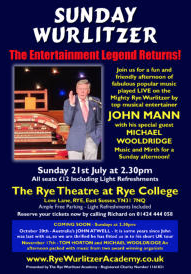 Sunday 21st July at 2.30pm Sunday Wurlitzer featuring ‘the UK’s favourite musical entertainer, John Mann with Michael Wooldridge. Known for his ability to make us all smile with his great music and wonderful humour, John always pleases his huge number of fans.