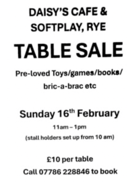 Pop along to Daisy’s Cafe & Soft Play this coming Sunday and pick up a bargain at our Table Sale. Free soft play for the kids while you browse.