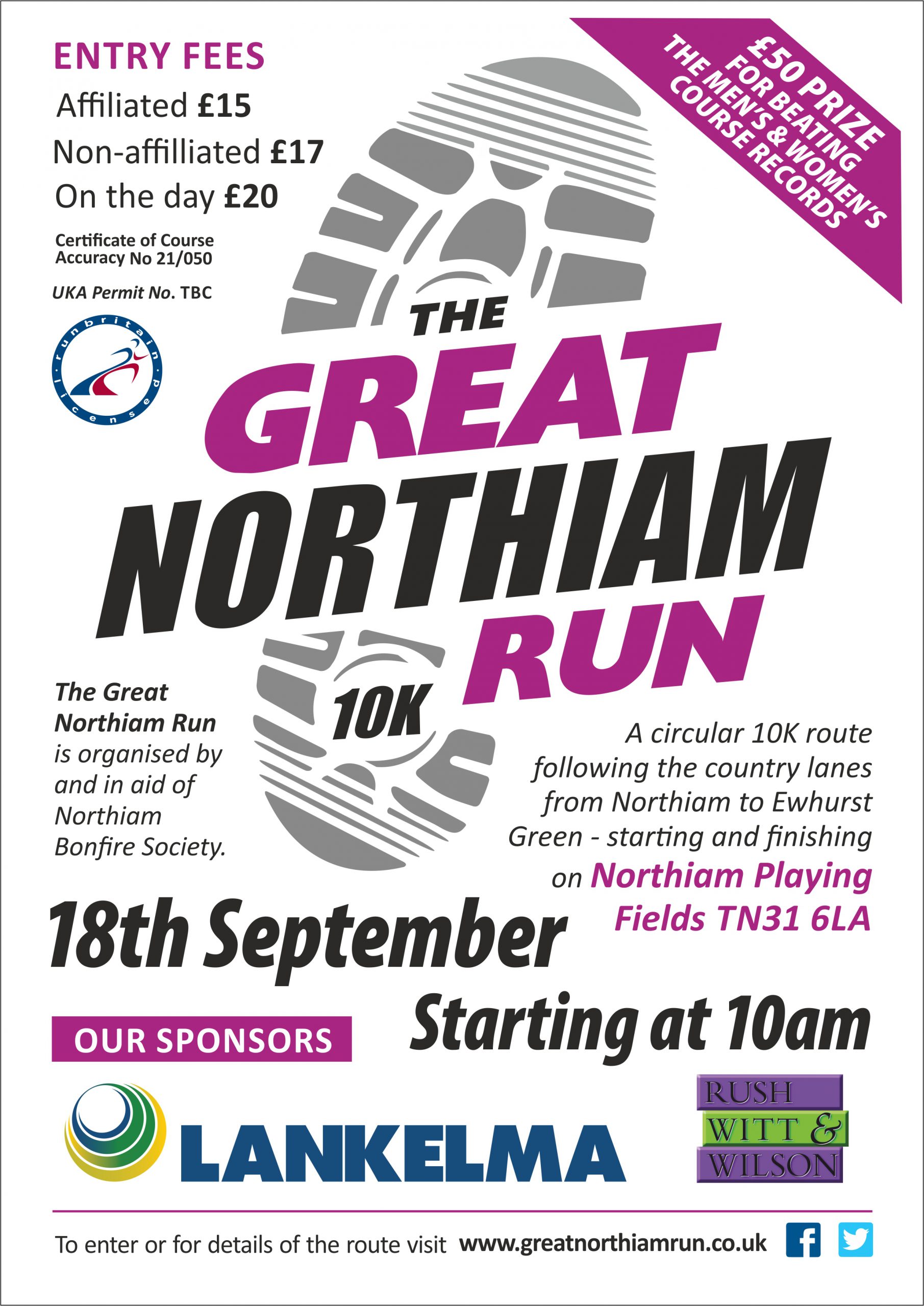The Great Northiam Run covers a 10k circular route from Northiam Playing Fields to Ewhurst Green via Sempstead and Lordine Lanes, returning via Ewhurst Lane.