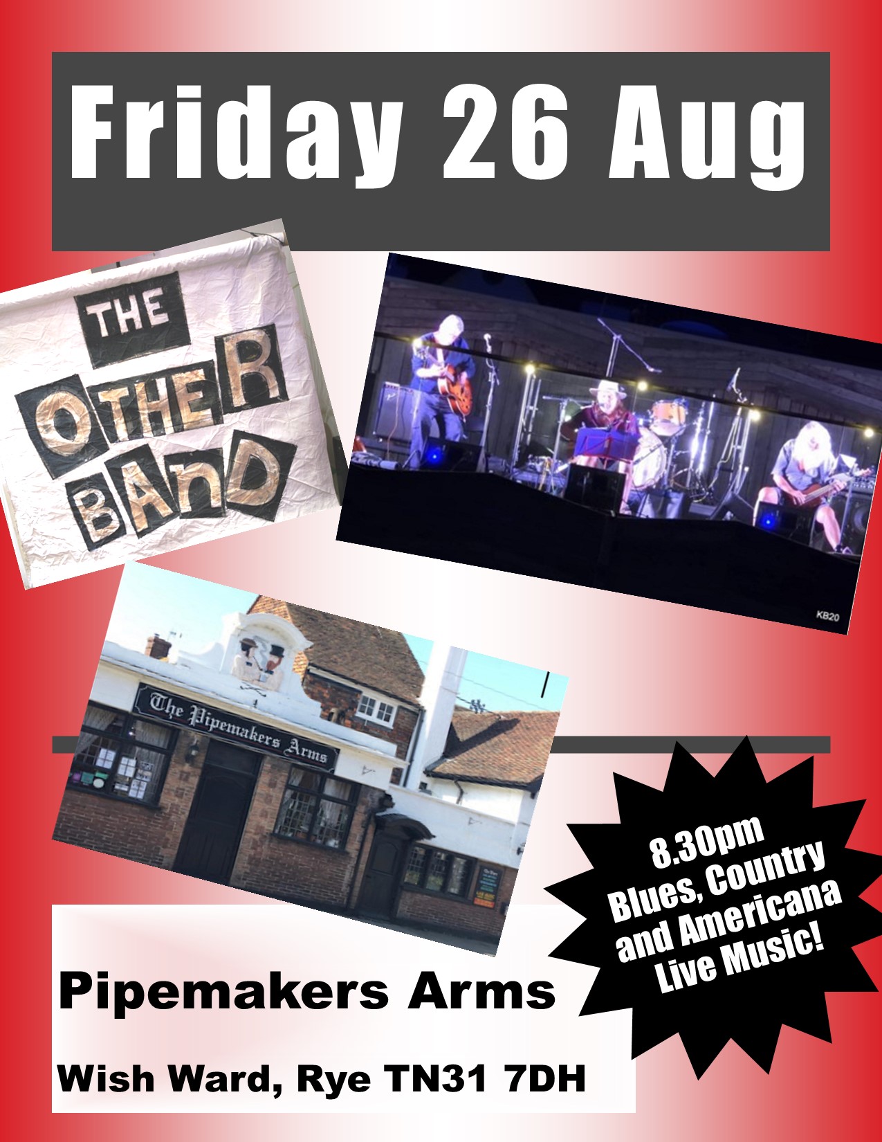 The Pipemakers Arms Hosts…The Other Band Blues, country and Americana from the established Hastings trio. + Add to Google Calendar + iCal / Outlook export The event is finished. Date Aug 26 2022 Expired! Time 8:30 pm - 11:00 pm Location The Pipemakers Arms Rye Category Music Share this event