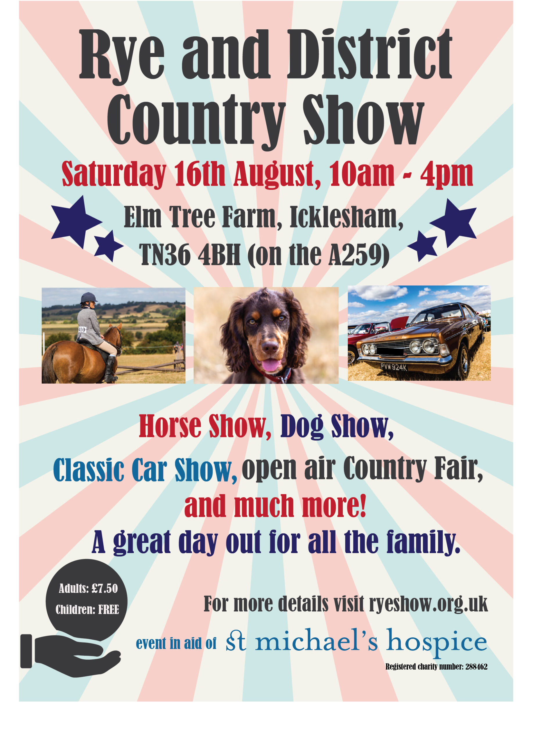 The Rye and District Country Show is organised annually by a dedicated committee in aid of St Michael’s Hospice and has become a staple on the local events calendar. Tickets are only £7.50, with under 16s going free, making it the perfect day out for the whole family. Visit ryeshow.org.uk to buy your ticket today, or simply turn up on the day to pay. For more information, call 01424 456396 or email fundraising@stmichaelshospice.com.