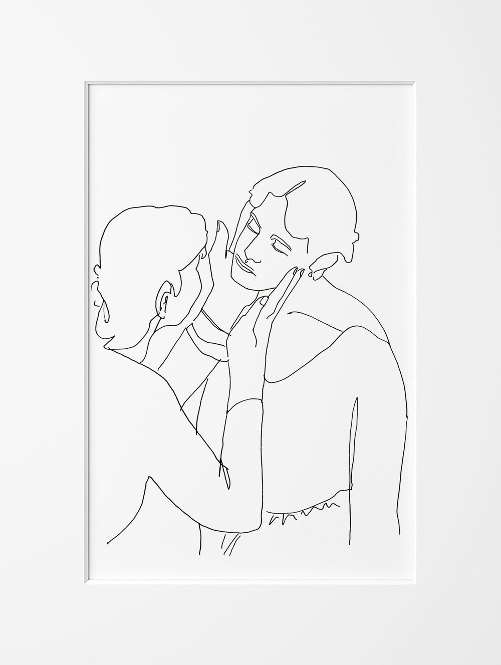 Alongside this are many works from the Line Drawing series. These graceful, peculiar, tender drawings in pen span many subjects, each one hinting at a story unfolding. Numbering over 2,000 drawings, this prolific series began in late 2019. The confidence of the mark-making and the sense of fluidity make these drawings appealing to both classical and contemporary tastes.