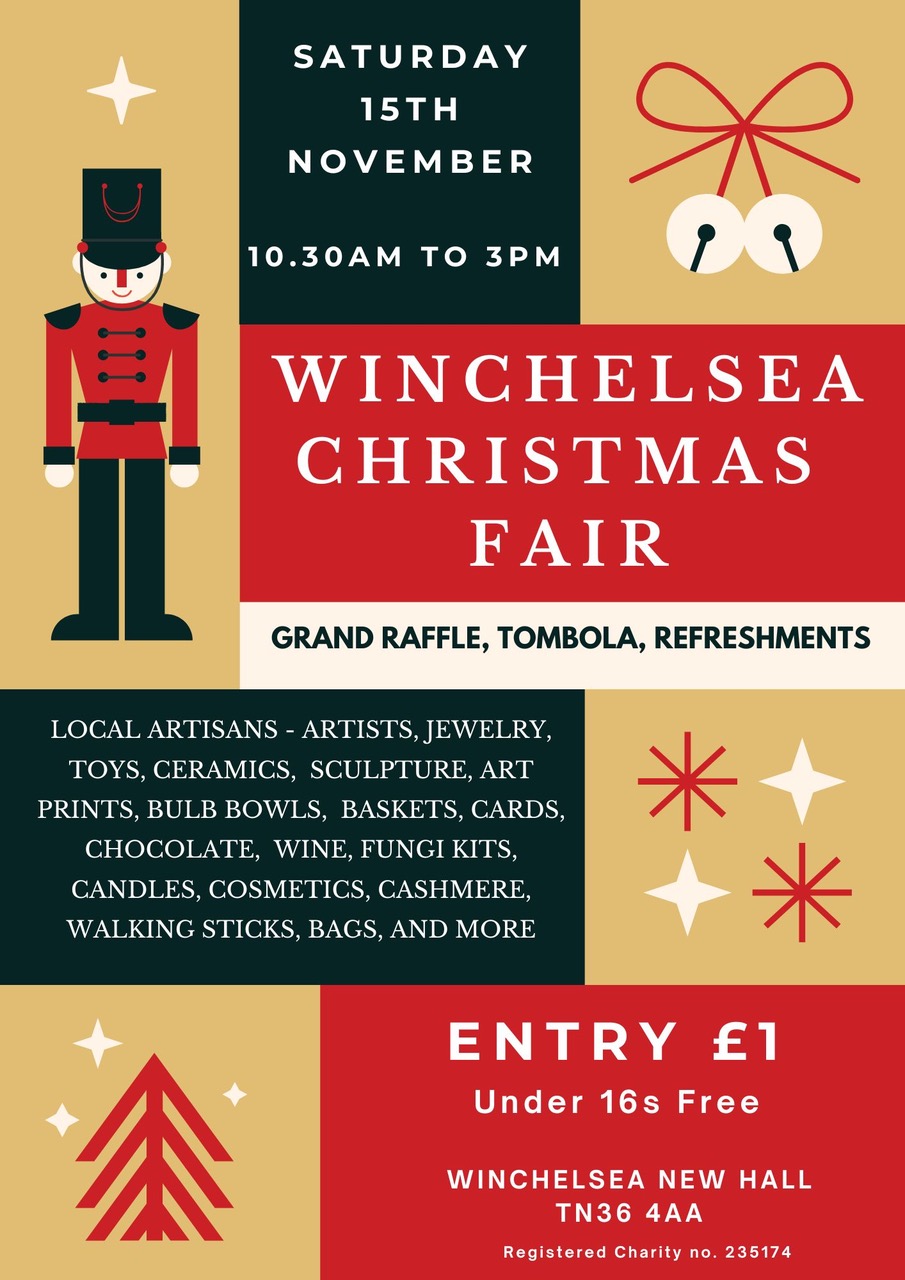 Please join us for the splendid Winchelsea Christmas Fair at the New Hall, Rectory Lane, TN36 4AA. This year the fair is held on Saturday 15th November 2025, between 10.30 am and 3 pm.