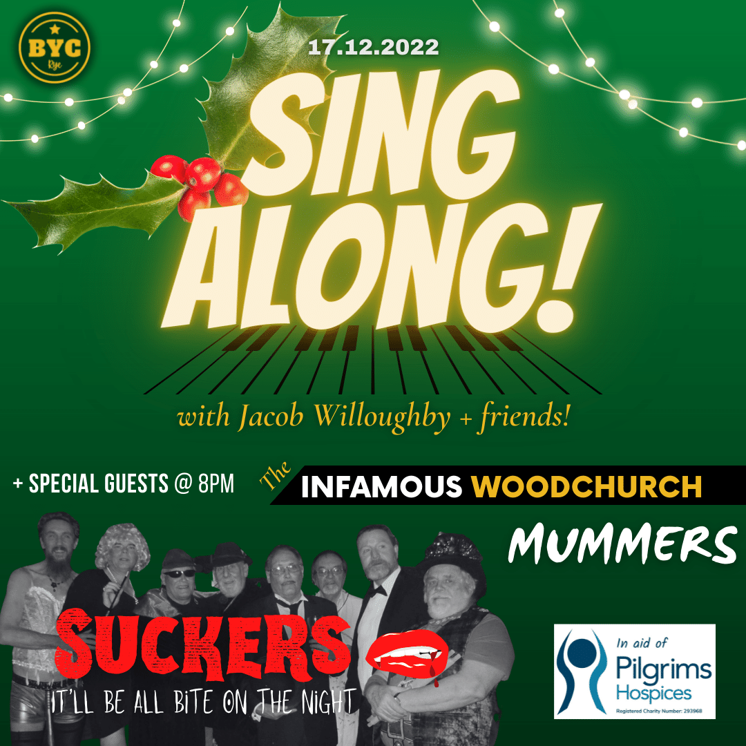 Join us as the infamous Woodchurch Mummers perform their tongue-in-cheek show ‘Suckers’ (in aid of Pilgrims Hospices), followed by a lively sing-along session with piano by Jacob Willoughby!