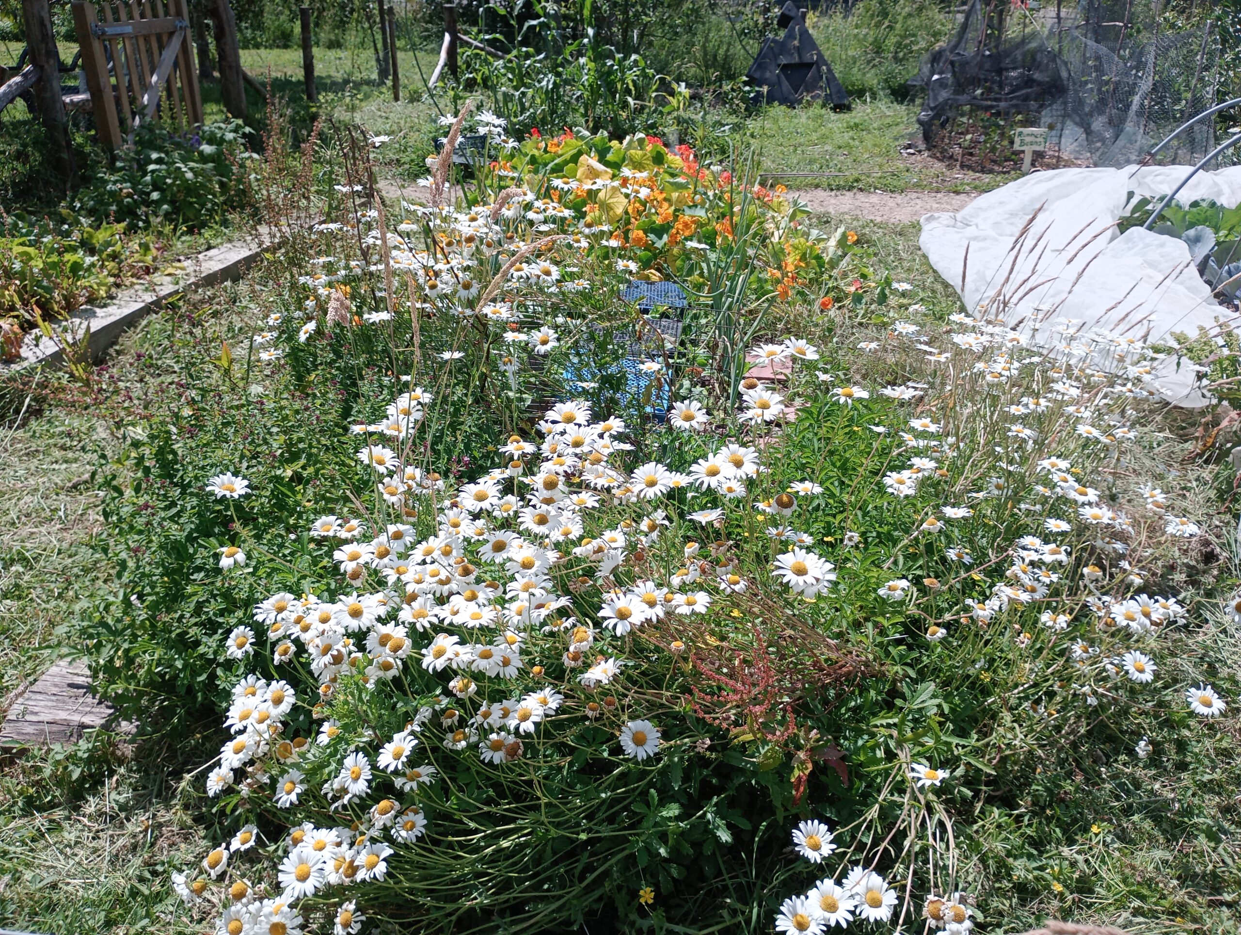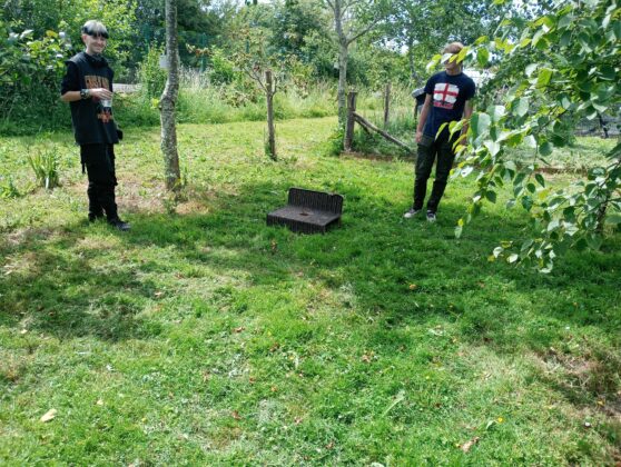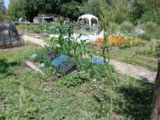 The ten years of planning and inventive planting transformed a flat bit of space near the allotments, into a thriving space with raised beds full of produce everyone is welcome to pick. A wonderful space has also been created for meetings: a circle of trees which were saplings when planted ten years ago.