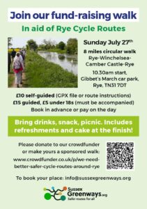 Sussex Greenways is holding a fund-raising walk on Sunday July 27, starting at 10.30am in Gibbet Marsh car park. The walk is an 8-mile circular from Rye to Winchelsea then back via Camber Castle to Rye again. The group is raising funds to improve cycle routes in and