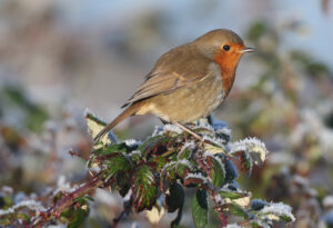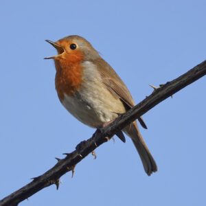 On cold winter days, the Robin’s song is often the only one you will hear. It is a melancholic undulation of a wide range of notes and tempos. The Robin is one of the most adept, if slightly gloomy, songsters. The non-breeding song is even less upbeat and quieter: a real plaintive affair that fits the atmosphere snuggly on still, chilled days.