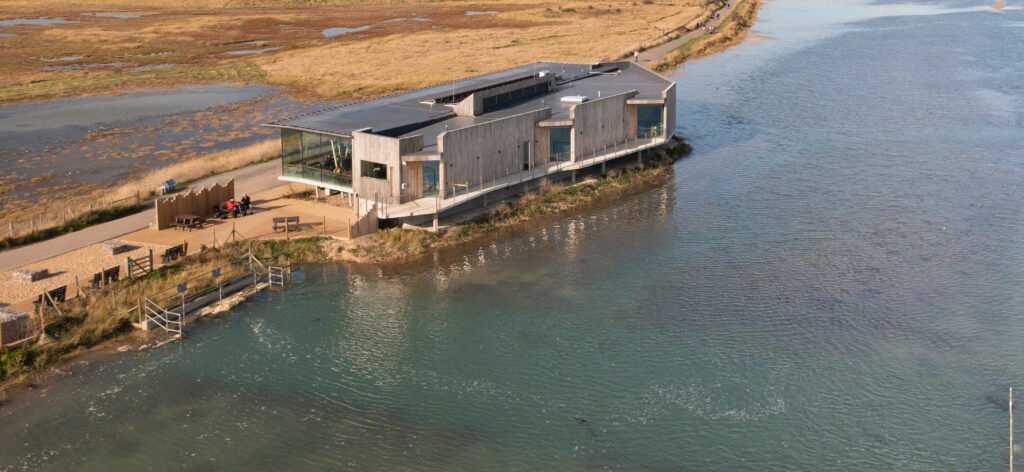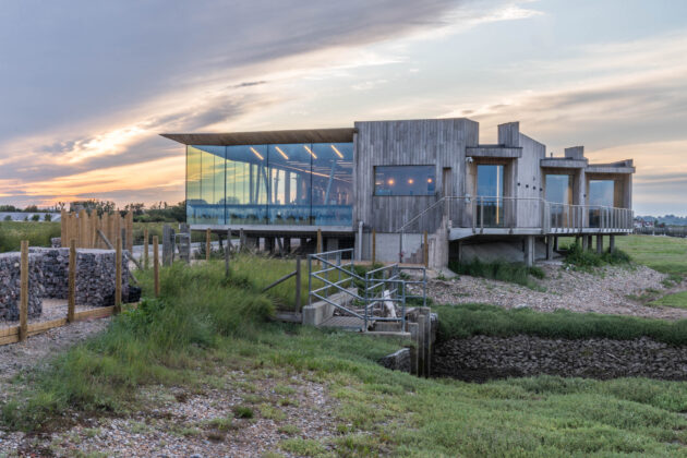 Edinburgh based architects Simpson and Brown were commissioned by the Sussex Wildlife Trust to design the building on a narrow site between the river Rother and the nature reserve path, and with the added challenge that it was to be built on saltmarsh and shingle ridges that occasionally flood.