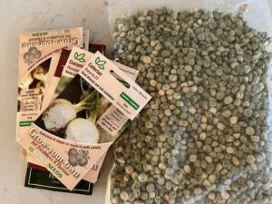 Vegetable seeds have arrived. A little unexpectedly, I ordered 1kg of green pea seeds, instead of 1 packet. We will be experimenting with growing pea shoots, as well as pea soup, and sharing our pea seed bonanza with other allotment holders. February signals the beginning of seed planting for us. I begin with our leek seeds – I find if I scatter the seed into a deep seed tray (an old mushroom container is my favourite), they will quietly sprout and slowly grow with little care over the next few months, ready for planting out in May. Greenhouse or windowsill access means we will also start peppers, tomatoes and even cucumbers and aubergine in February. And our allotments needs our attention: Weeding, tilling and addition of compost to get the soil ready for planting.