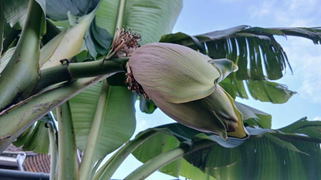 This year, for the first time, one of my plants is flowering! A rugby ball-sized green leafy bud appeared in the crown of the plant. Over a couple of days, it raised up on a stem and hung over the side under its significant weight. The outermost bract peeled off yesterday revealing a row of tiny green proto-bananas with a yellow tube-shaped flower on each. More rows have appeared over night.