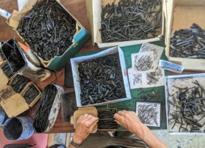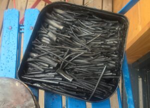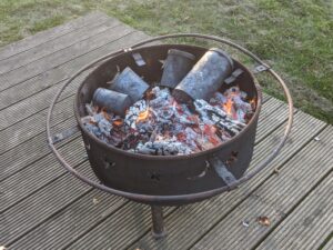 The willow is then cut into lengths and put into tins which are put in a fire. The reduced oxygen in the tin means that the willow doesn’t burn when it gets hot but any moisture and volatile constituents are removed, escaping through a tiny hole that we make in the top of the tin. The tins have to be left to cool before opening otherwise the influx of oxygen will mean the sticks will burn completely.