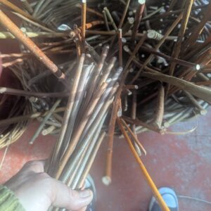 All the artist’s charcoal we make starts its life as willow growing on our plantation. After using the willow for my basketry work, I collect all the trimmings. The thicker trimmings and left-over pieces are what we use to make the charcoal, while the thinner bits are bundled up and dried to use as kindling on our fire.