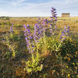 Hard-by the high water mark you can find one of the nature reserve’s treasures – the low-lying cerise flowers of the very rare Sea Pea, like a crawling, cowering sweet pea, reaching out for the brine. Further away from the sea the dramatic purple towers of Viper’s Bugloss look on.