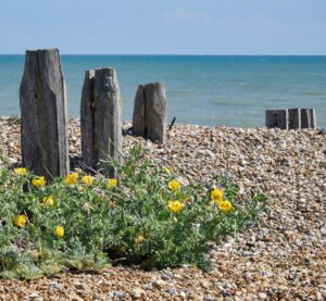 Yellow Horned-poppy shows off stunningly shiny flowers and long sickle-shaped seed pods. Sea Kale has fleshy ‘sea-cabbage’ leaves and white flowers that drip with a sweet honey scent that hangs over the beach. Later in the year the dried-up plants will break loose from the shingle, become tumbleweed, and seek new footholds on the nature reserve – or maybe they’ll be swept to sea, then carried by longshore drift down the coast, heading for Kent. You’re welcome.