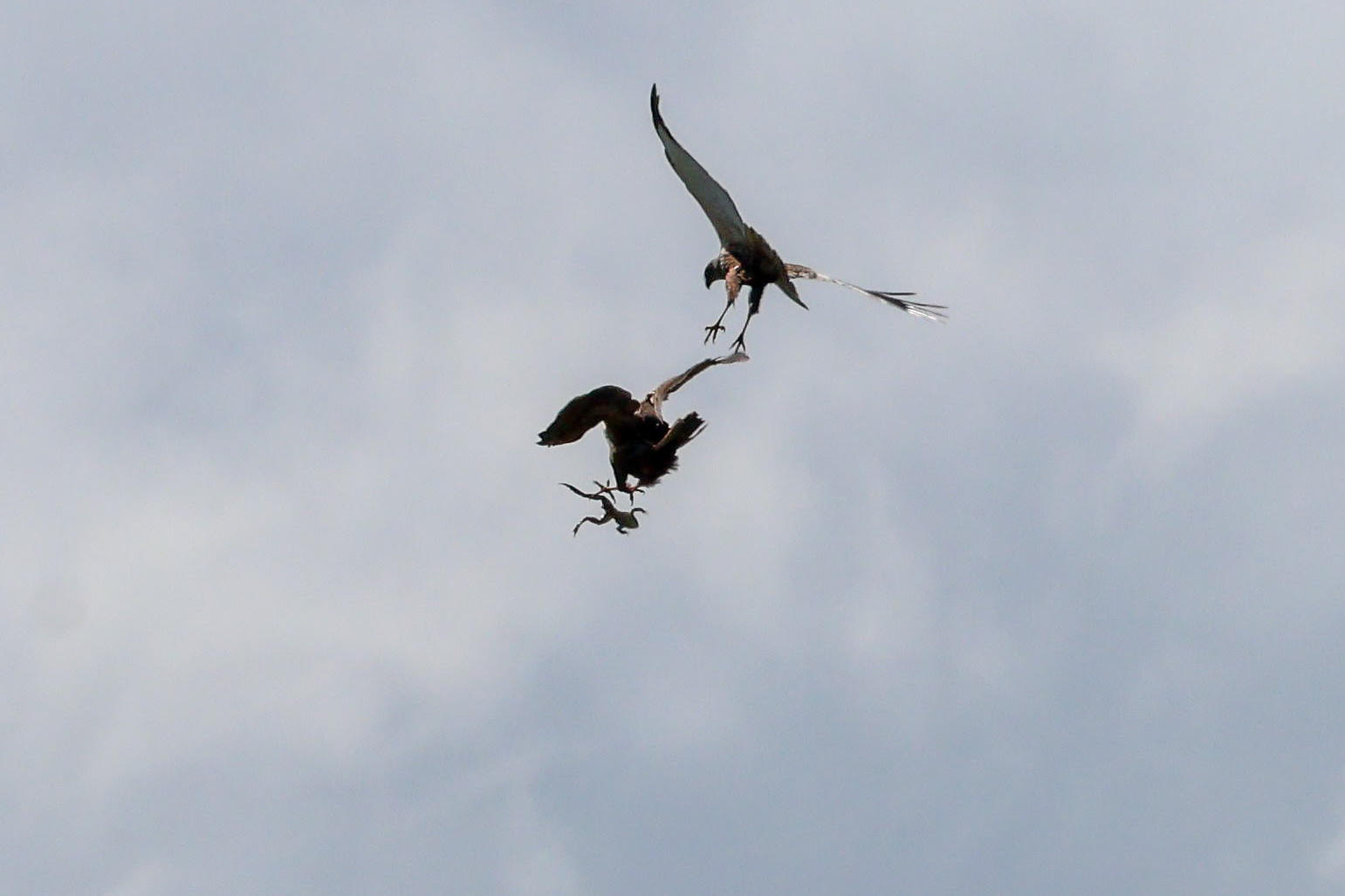 Marsh Harriers passing food – a marsh frog