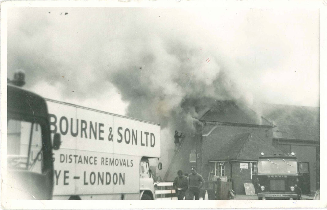A second fire occurred in May 1974 in the early hours of a Sunday morning. “I was woken by my cousin to advise that there were small explosions and flames through the roof of the building. I went straight there and found Rye fire brigade already on site with two pumps. I managed to open the garage and office doors for them… whilst I moved the two lorries parked immediately outside the building. We then set about moving as much as we could out of the office to preserve the paperwork,” said Eric.