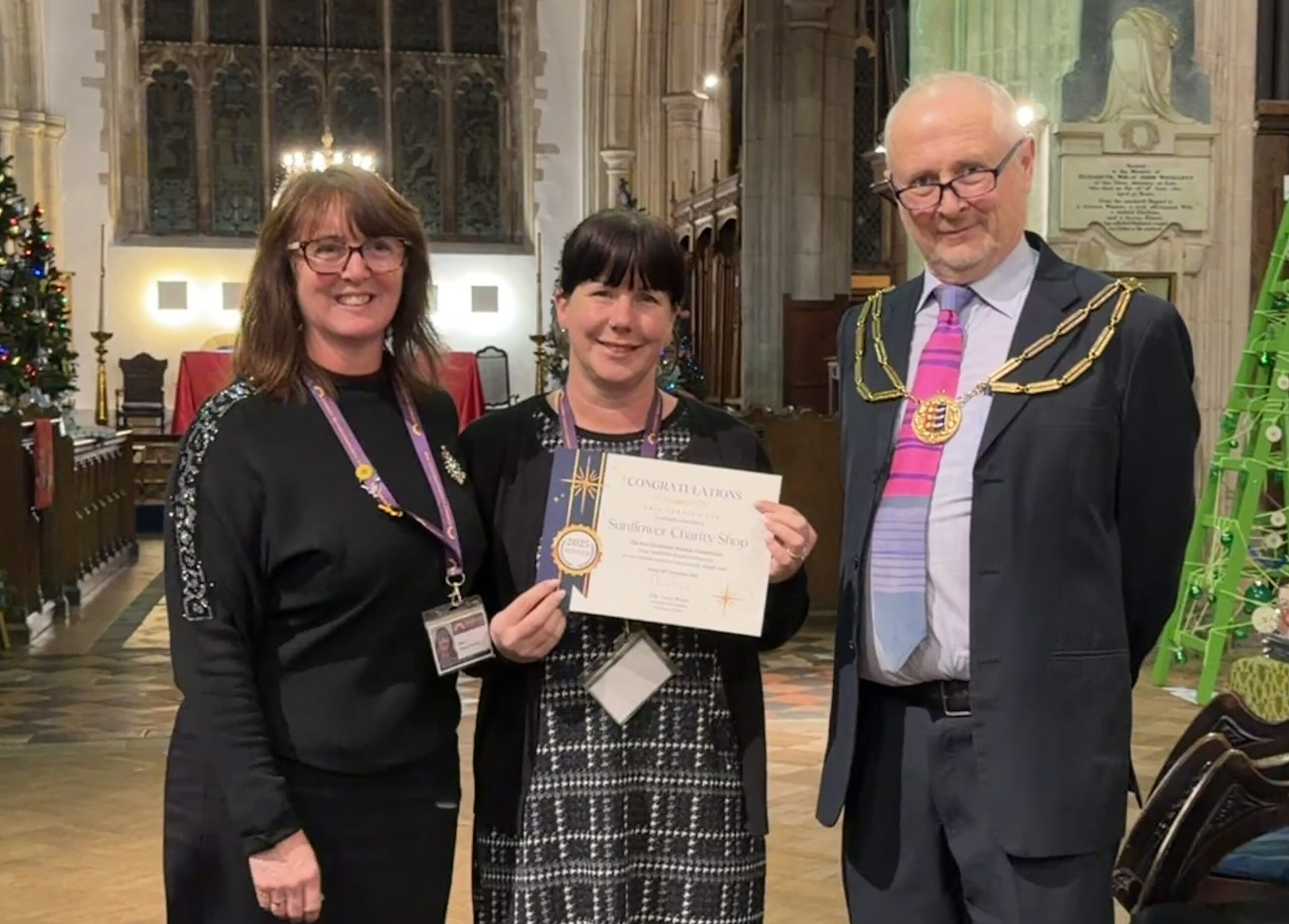 Cllr Andy Stuart Mayor of Rye with the winners of the Christmas Windows Competition The Sunflower Charity Shop